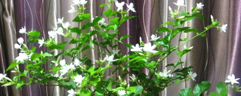 茉莉花苗分枝向两侧分开是因为缺少光照引起的,如果光照充足那就是缺少氮肥了。茉莉花是木犀科、素馨属直立或攀援灌木,高达3米。小枝圆柱形或稍压扁状,有时中空,疏被柔毛。叶对生,单叶,叶片纸质,圆形、椭圆形、卵状椭圆形或倒卵形,两端圆或钝,基部有时微心形,在上面稍凹入或凹起,下面凸起,细脉在两面常明显,微凸起,除下面脉腋间常具簇毛外,其余无毛;裂片长圆形至近圆形,先端圆或钝。果球形,呈紫黑色。花期5-8月,果期7-9月。茉莉的花极香,为著名的花茶原料及重要的香精原料。