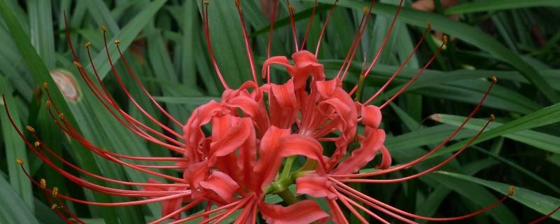 石蒜的叶子呈窄带状,颜色为深绿色,中脉有粉绿色带,像宽大版的水仙叶。石蒜原产于中国,在长江流域及西南各省均有分布。石蒜是东亚常见的园林观赏植物,冬赏其叶,秋赏其花。是优良宿根草本花卉,园林中常用作背阴处绿化或林下地被花卉,也会在花境丛植或山石间自然式栽植。
