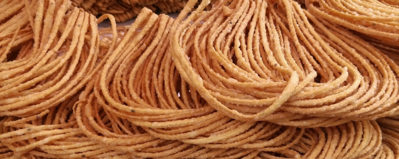 3、待面条在盆中回透,弹拉力恰到好处时,将面条绕在手上,用手来回抻开,撑、绷成粗细均匀一致的馓子条。