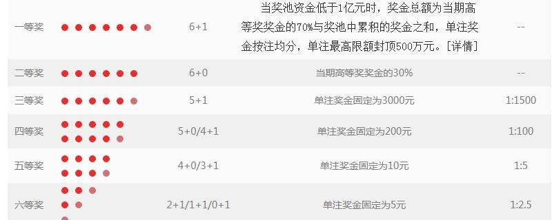 六等奖:1个蓝色球号码相符(有无红色球号码相符均可)。