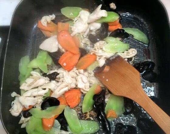 5、锅倒适量油,油热倒鸡肉片滑炒变色。