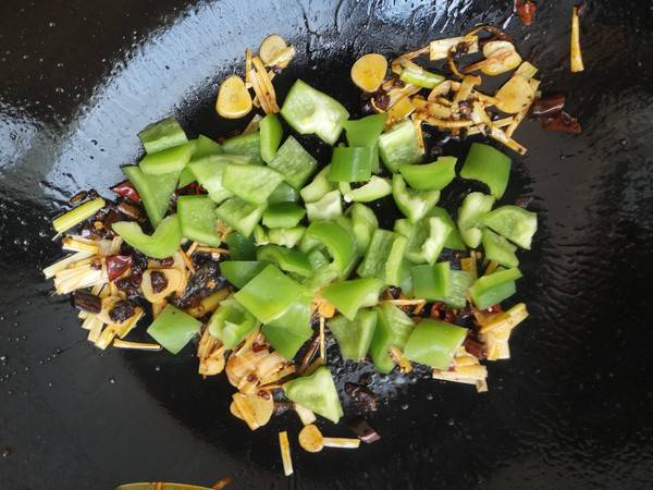 2、青椒切块,葱切葱段,姜切丝,蒜切片。
