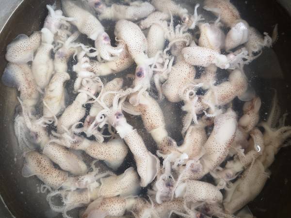 3、锅中加水,将小海兔放入,中火焯烫,海兔须卷起,身体变紧有弹性时,关火捞出。