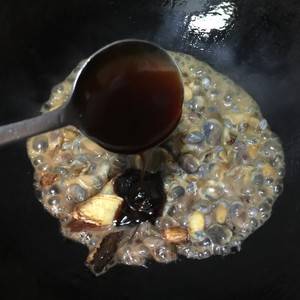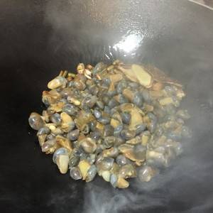 5、再倒入泥螺,迅速翻炒,倒入少许料酒。