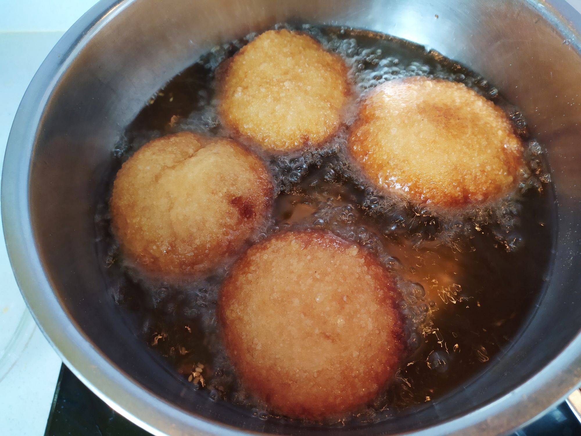 6、放入6成油锅中,小火炸制上色翻面,两面金黄即可。