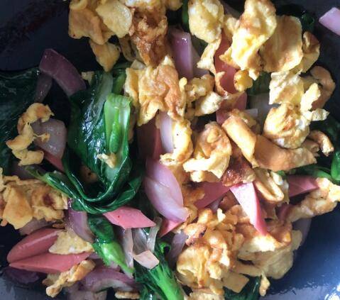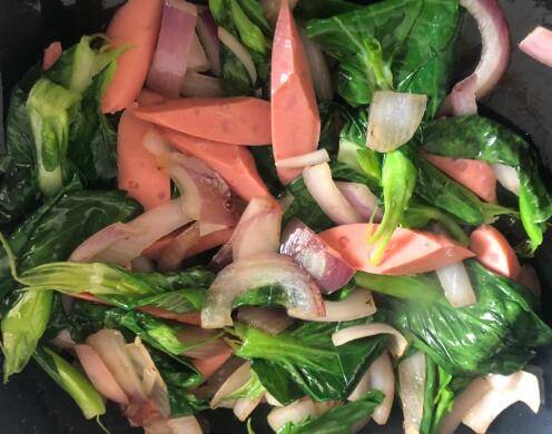 至洋葱香味溢出,再加入香肠、小青菜翻炒。
