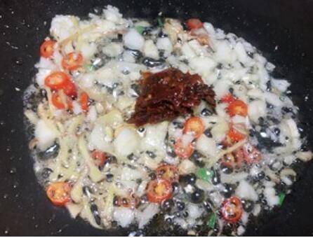 4、火热倒油炒香姜蒜和少许辣椒,加入豆瓣酱和花椒炒香。