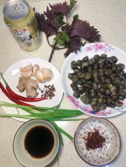 1、食材准备:田螺1斤、姜1块、蒜瓣2瓣、花椒十几粒、葱3根、盐适量、生抽两勺、啤酒1瓶、辣椒、紫苏一枝。