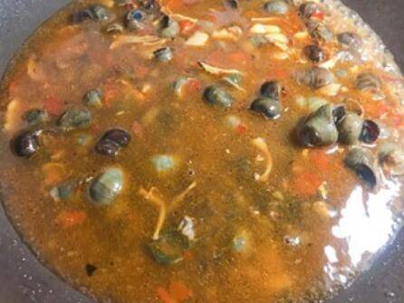 5、倒入田螺,翻炒均匀后倒入生抽,再加入啤酒,末过田螺加盖煮五分钟。