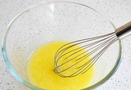 2、玉米油、鸡蛋和白糖混合均匀。