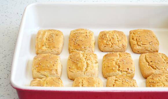 7、将方形面饼切成若干小方块,刷蛋液,撒白芝麻。