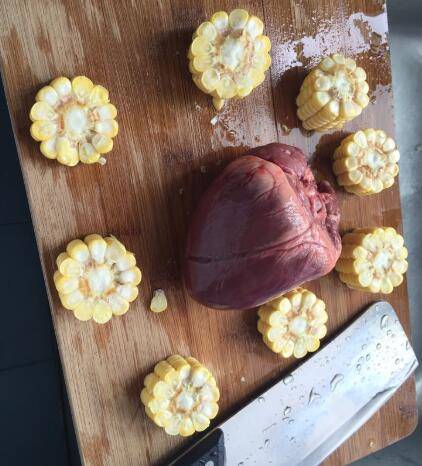 1、准备食材:猪心玉米、枸杞。猪心切片,洗干净,注意要把上面黑色的血洗了,买了的时候这么血由于血小板的作用应该已经凝固了,别把它认为是肉了。不然等下煮成一锅红色,虽然挺漂亮,味道可不敢保证。