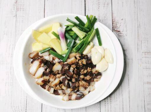 所有食材洗干净,腊肉去掉猪皮切成小块。姜切片,蒜头去掉皮,拍扁,葱切段。