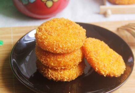 南瓜泥100克、糯米粉120克、绵白糖15克、鸡蛋1个、面包糠半碗。