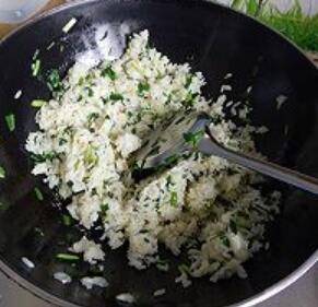 用料:韭菜80克、米饭1碗、盐4克、鸡精适量。