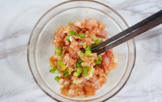 5、将香葱放入肉馅中搅拌。