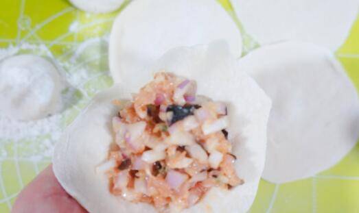 8、将适量的肉馅放到面皮上。