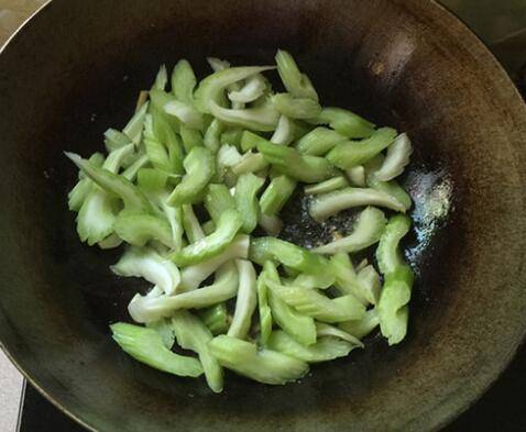 5、锅中留底油,下姜丝和芹菜。