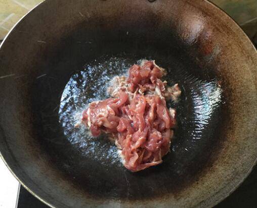 4、铁锅烧油,油温升起放入腌制好的肉片。