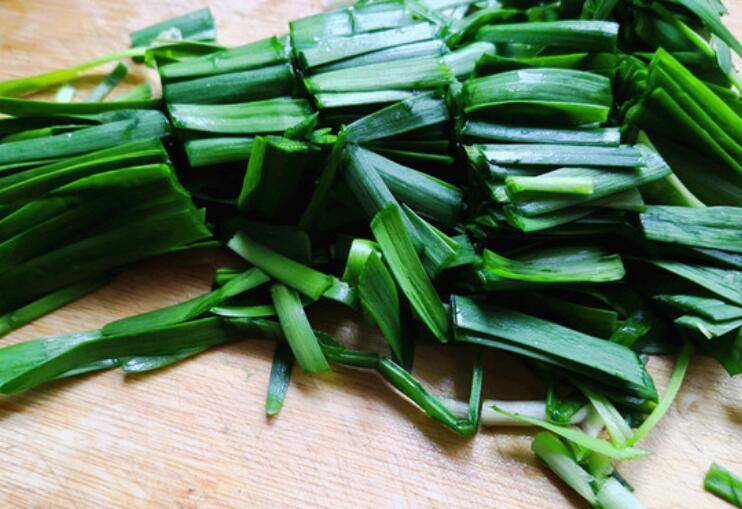 2.韭菜去掉不好的叶子,清洗干净,切去头部大约2mm的样子,这样是防止头部有沙土洗不干净,影响口感也不卫生,再切成1寸长的段。