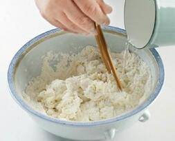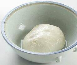 2、在面盆中反复揉面团直至表面略光滑,然后从剩余的水中取少许抹在面团表面,静置10分钟。