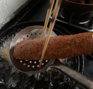 4、平底锅放油三分之二,油温烧至七成热。