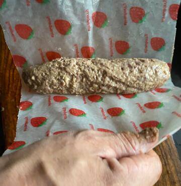 5、案板上铺一张防油纸表面刷油,放入肝泥稍为整理一下,两手提起防油纸两端,来回滚两下。
