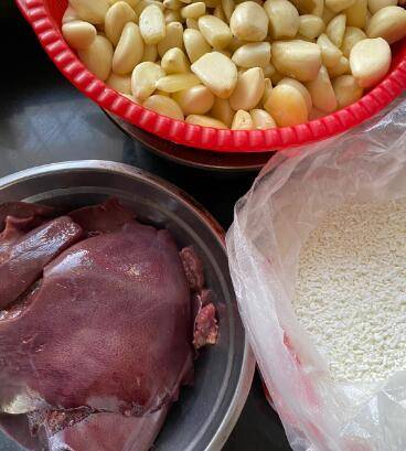 用料:鲜猪肝1500克、大蒜1500克、小粉1400克、鸡蛋2个、生姜一块、大葱少许、八角粉8g、十三香6g、花椒粉3g、食盐130g、陈醋少许。
