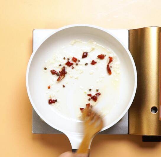 锅中放入食用油5毫升,倒入蒜末、花椒2克、干辣椒3克,大火爆香。
