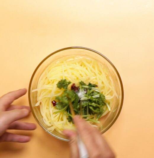 倒入土豆丝,倒入调料、香菜、白醋10克、盐2克,搅拌均匀。