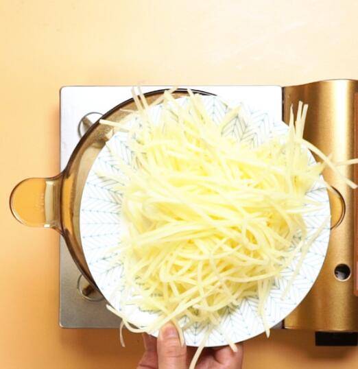 清水500毫升,大火煮沸,倒入土豆丝,焯水30秒。