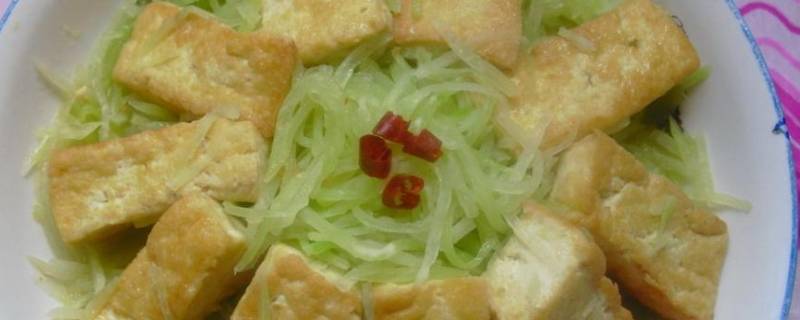 少许油,烧热,放入豆腐皮煎至两面焦黄色,装起,切成条。