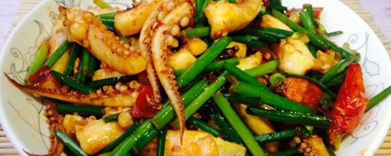 2、鱿鱼洗净去内脏切成条,韭菜切段。