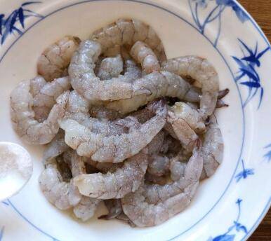 将虾仁放入碗中,加少量盐。用手抓匀放置5分钟(用盐先抓洗一下就可以洗去表面的黏液,这样炒出来的虾仁才会清脆好吃)。