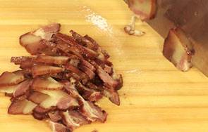 6、倒入腊肉。