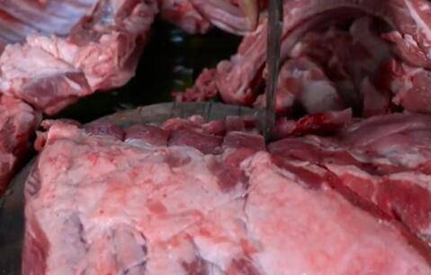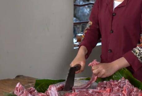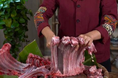 3、一只手抓着排骨,一只手拿着刀。