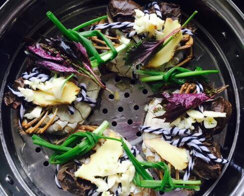 4、每个蟹上分别放上一片姜、一个葱结、一段紫苏和一些蒜末备用。