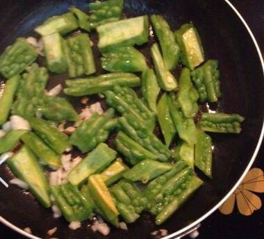 蒜头切碎,凉瓜切成条状备用(可切成薄片,形状各人喜好)。