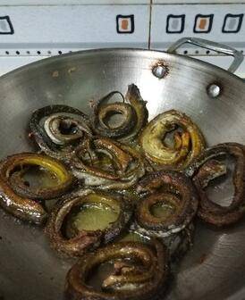 2、热锅烧油,加入青花椒、八角爆香;黄鳝吸干水分,入锅香煎,直至鳝身盘卷,色泽金黄,再小心翻面再煎。
