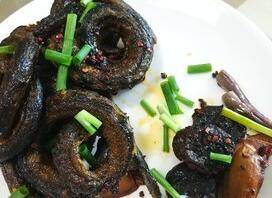 用料:黄鳝、鸡腿菇适量、盐、油、十三香、青花椒、八角、料酒、牛肉辣椒酱适量。