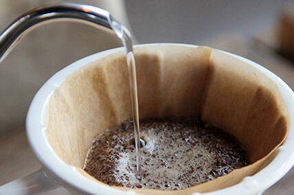 5、把磨好的咖啡粉放入滤纸中,围绕滤杯中心绕圈缓缓注入水,烘焖蒸15秒。