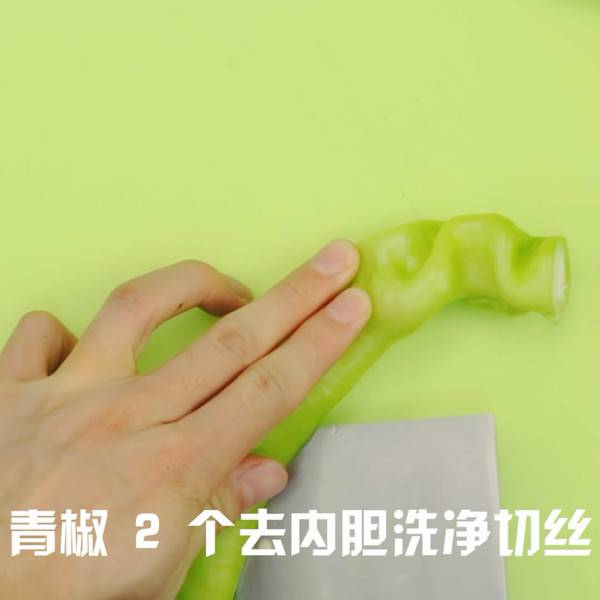6、肉丝炒半熟后,倒入青椒翻炒。