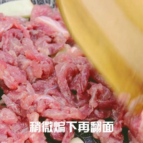 4、锅中放入食用油,加入大蒜爆香,倒入肉丝。