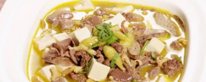 猪肝豆腐汤:是一道汉族美食,有清肝和胃,补肝益肾的功效。猪肝洗净、切片;豆腐切丁;黄豆芽洗净、切末;葱切末。锅内放油烧热,放入葱末煸香,再放入猪肝、黄豆芽,炒出香味时加足量的水,在旺火上烧开。放入豆腐改小火慢烧约10分钟,加入盐、味精即可。