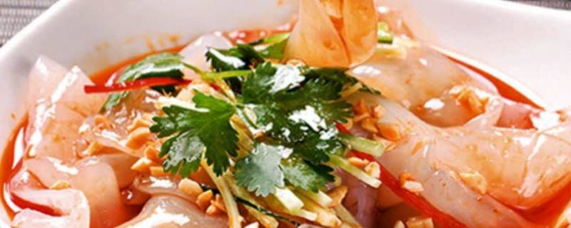 5、凉皮切条,黄瓜切丝,花生拍碎,面筋切块,小米辣切碎,加入调料拌匀即可食用。
