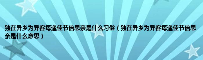 大家好,小常来为大家解答以上问题。独在异乡为异客每逢佳节倍思亲是什么习俗,独在异乡为异客每逢佳节倍思亲是什么意思很多人还不知道,现在让我们一起来看看吧!