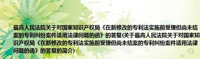 大家好,最高人民法院关于对国家知识产权局《在新修改的专利法实施前受理但尚未结案的专利纠纷案件适用法律问题的函》的答复,关于最高人民法院关于对国家知识产权局《在新修改的专利法实施前受理但尚未结案的专利纠纷案件适用法律问题的函》的答复的简介很多人还不知道,现在让我们一起来看看吧!