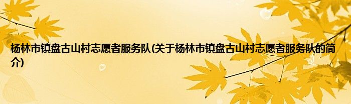1、 杨林市镇盘古山村志愿者服务队是由松滋市杨林市镇志愿服务队领导下的志愿团体。